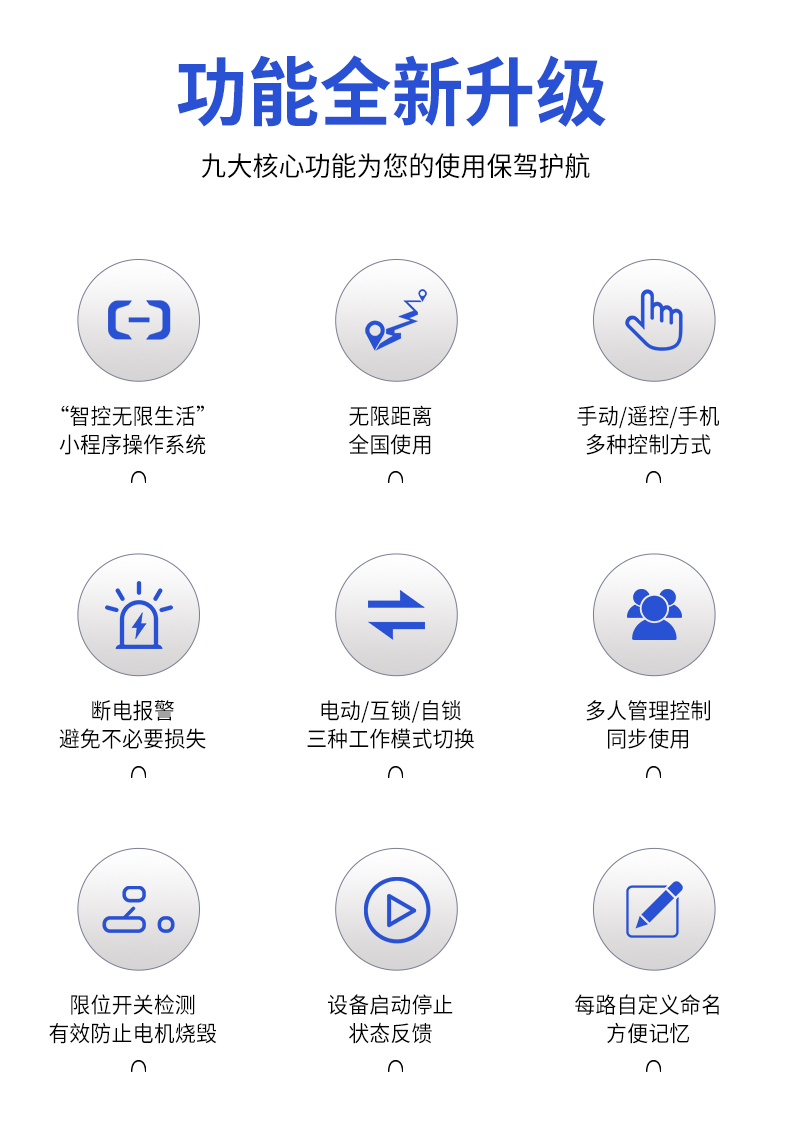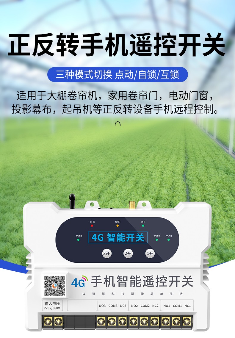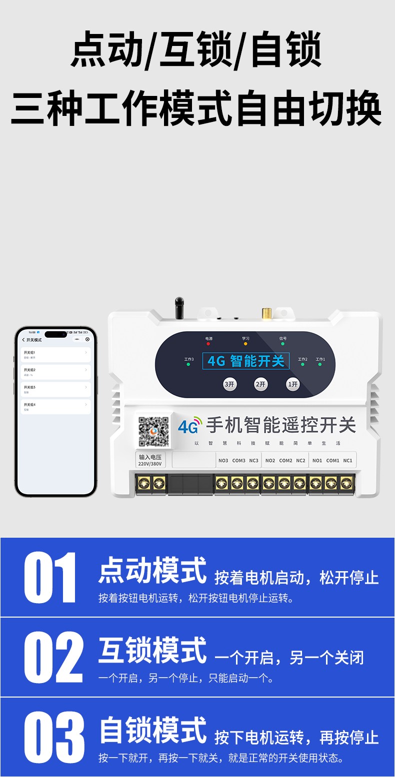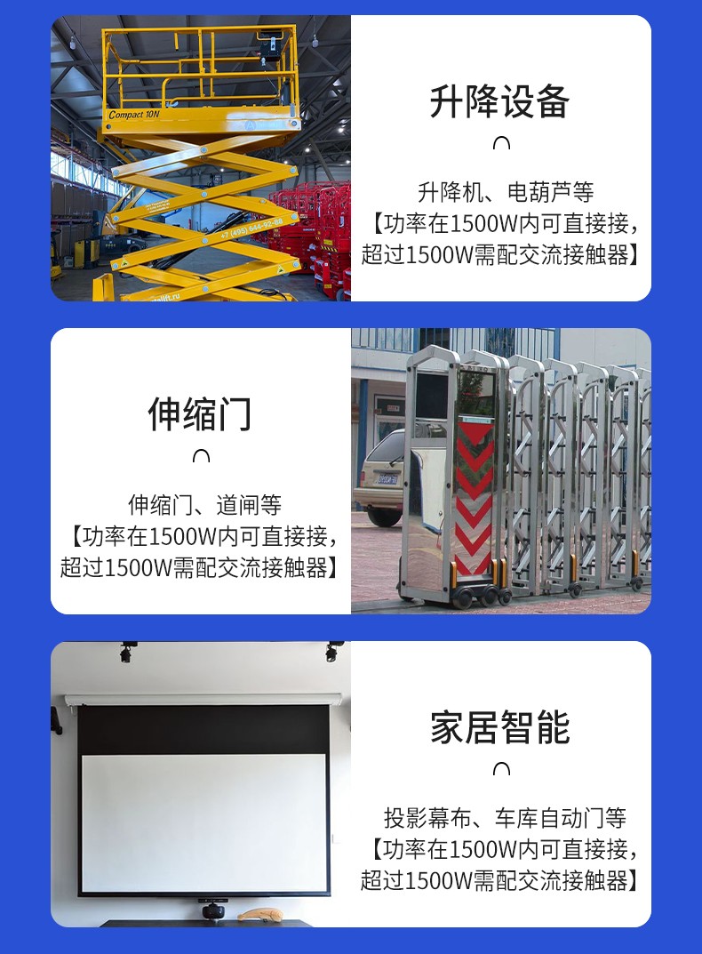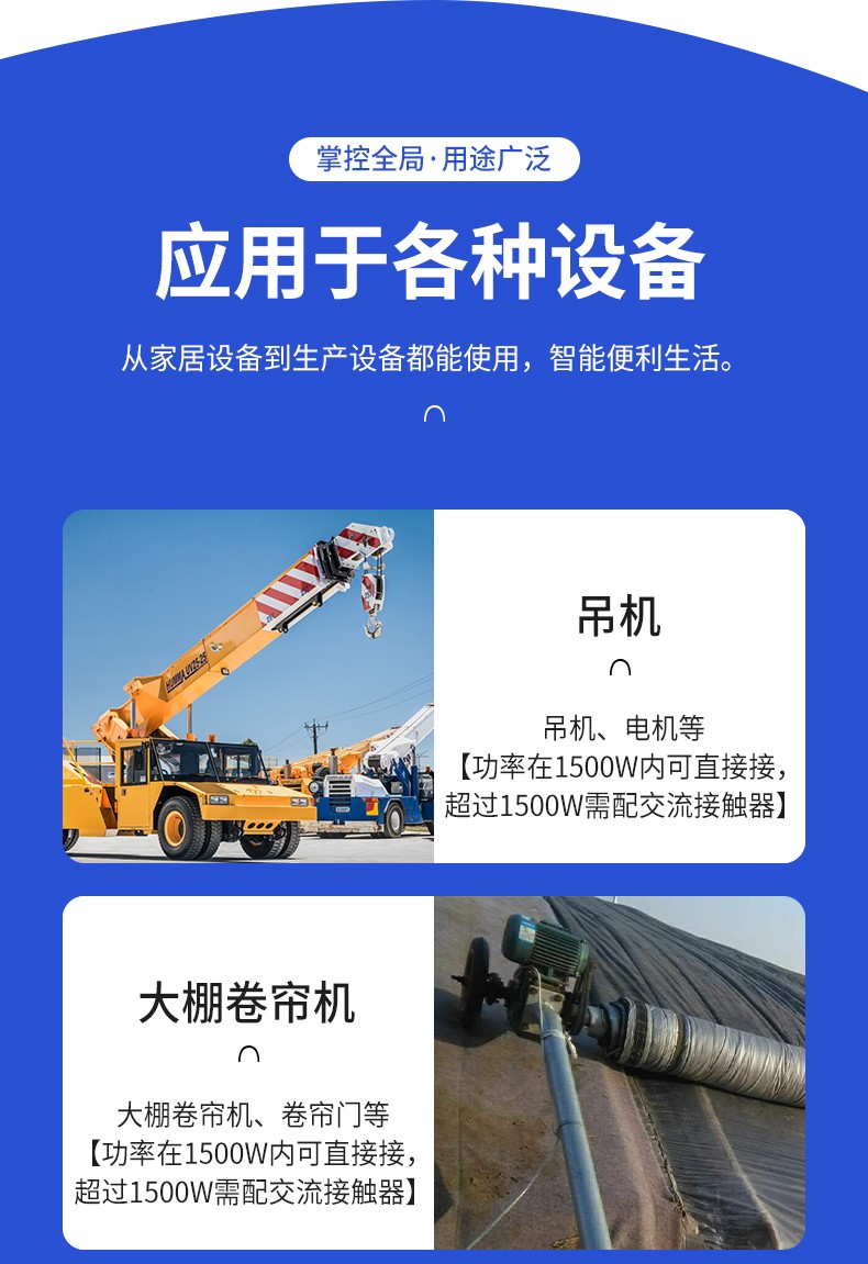 電機正反轉(zhuǎn)遙控開關(guān) 產(chǎn)品規(guī)格 功能特點 資料下載 電機正反轉(zhuǎn)遙控開關(guān)智控?zé)o限生活小程序操作系統(tǒng)三種模式切換:點動/自鎖/互鎖控制方式:手動、遙控、手機斷電報警多人管理控制同步使用設(shè)備啟動停止?fàn)顟B(tài)反饋每路自定義命名手機不限制距離輸入電壓:280v/380v通用應(yīng)用場景:起吊設(shè)備 ,大鵬卷簾機、升降設(shè)備、正反轉(zhuǎn)電機,工業(yè)信號控制, 投影幕布等