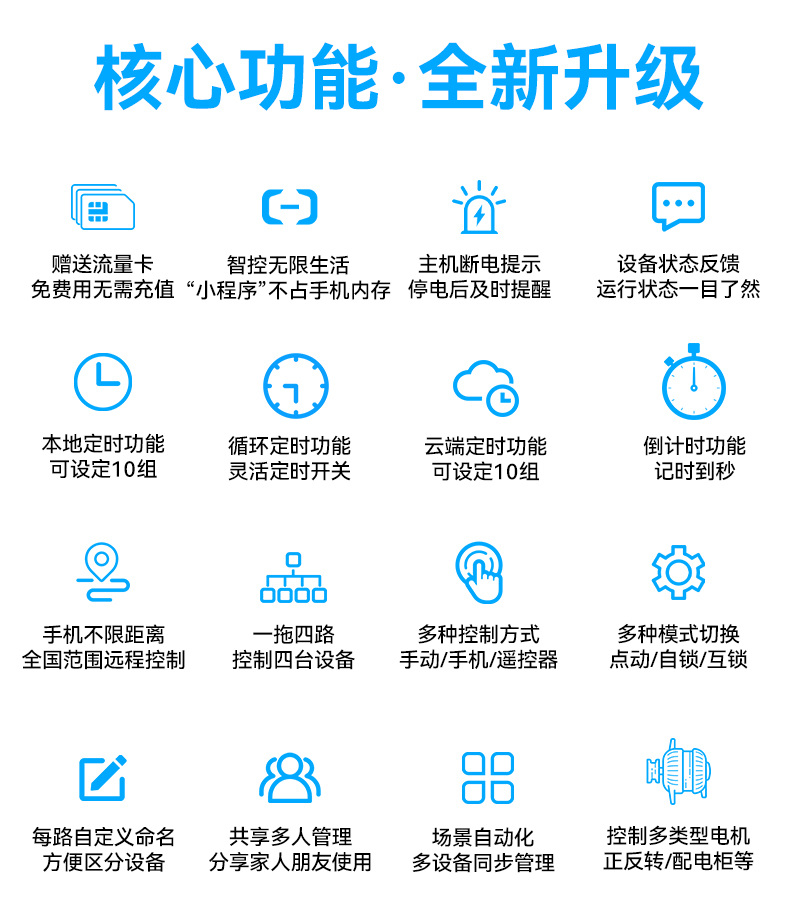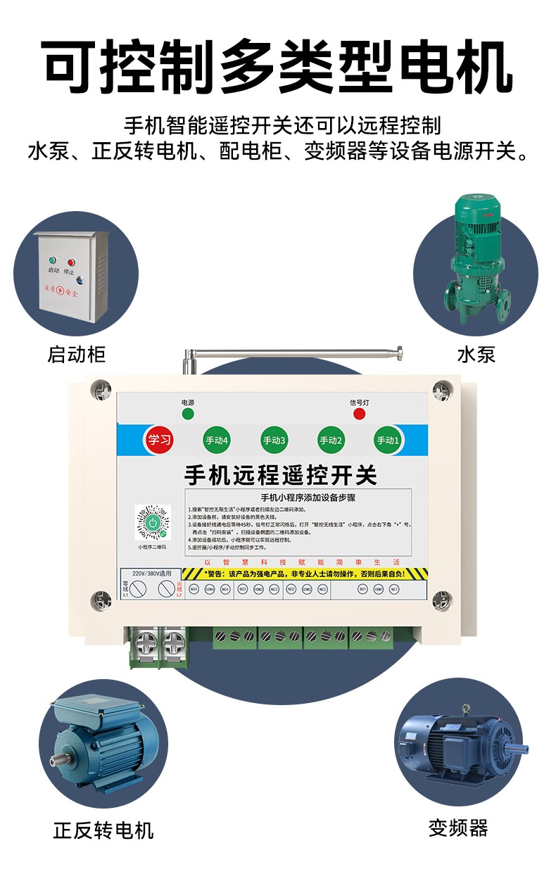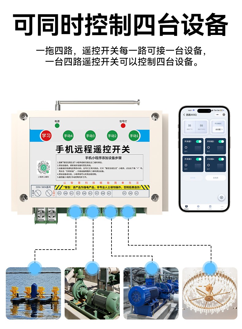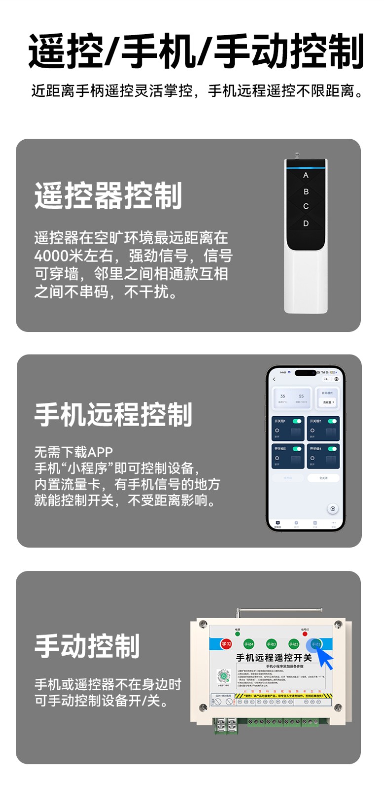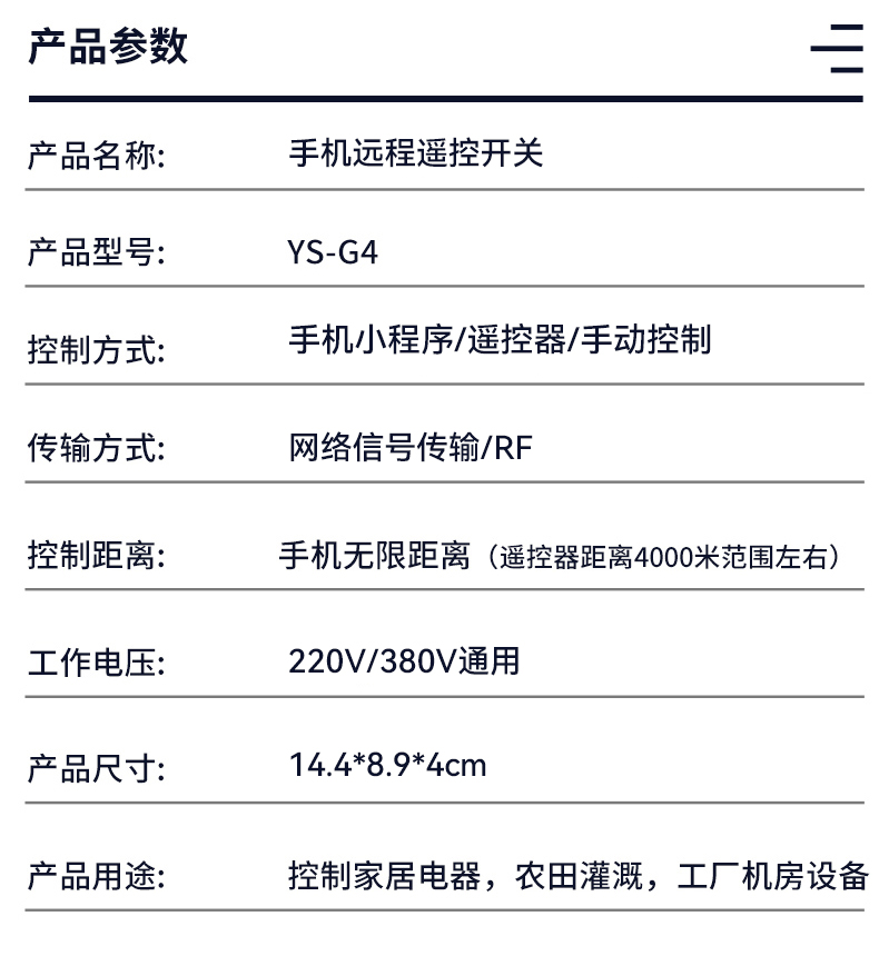 4G遠程控制開關(guān)(YS-G4) 產(chǎn)品規(guī)格 功能特點 資料下載 4G遠程控制開關(guān)(YS-G4)1.無需WiFi 、無需插卡、無需流量2.有手機信號就能控制 、手機無線距離(遙控器空曠距離4000米)3.分享管理 4.狀態(tài)反饋 5.實時反饋狀態(tài)5.自定義開關(guān)6.斷電反饋提醒7.一鍵分享控制方式:小程序控制 、 RF遙控器控制、 手動按鍵應(yīng)用場景:水泵電機, 增氧機 ,家居電器燈具,農(nóng)田灌溉,工廠機房設(shè)備