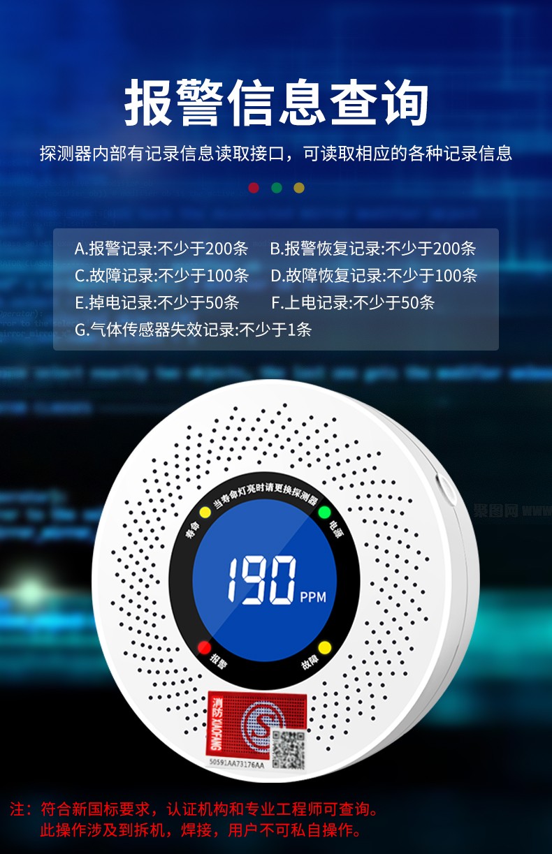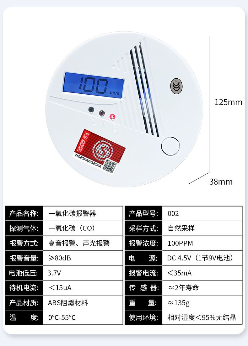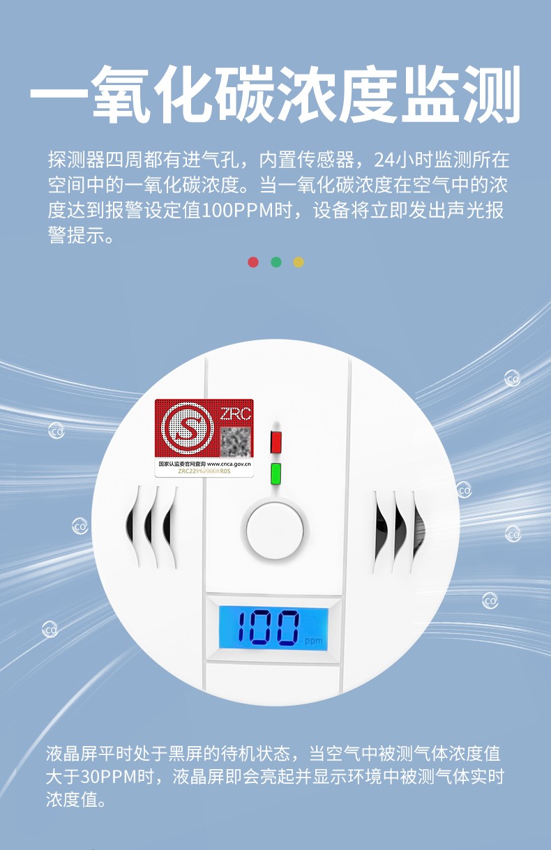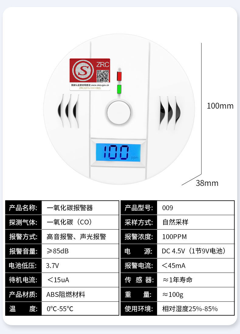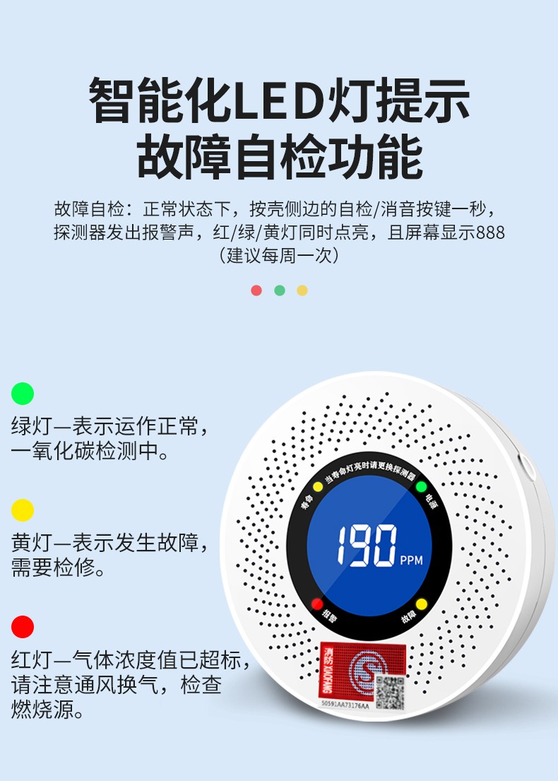 一氧化碳報警器(型號PA-009) 產(chǎn)品規(guī)格 功能特點 資料下載 一氧化碳報警器(型號PA-009)1.檢測氣體、燒煤、燒柴、燒炭、蜂窩媒、露營封閉環(huán)境、封閉車內(nèi)2.85分貝報警音量3..LED液晶屏幕顯示4.故障自檢: 綠燈(正常)、黃燈 (故障、需要檢修) 紅燈(氣體濃度超標(biāo))5.報警方式:蜂鳴聲提示 6. 產(chǎn)品保險:1000萬承險7. ABS阻燃材質(zhì)適用場景:適用于廚房、浴室、起居室、火鍋包廂、飯?zhí)玫乳L時間空氣不流通的場所安裝一氧化碳報警探測器