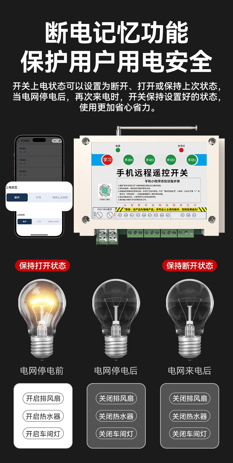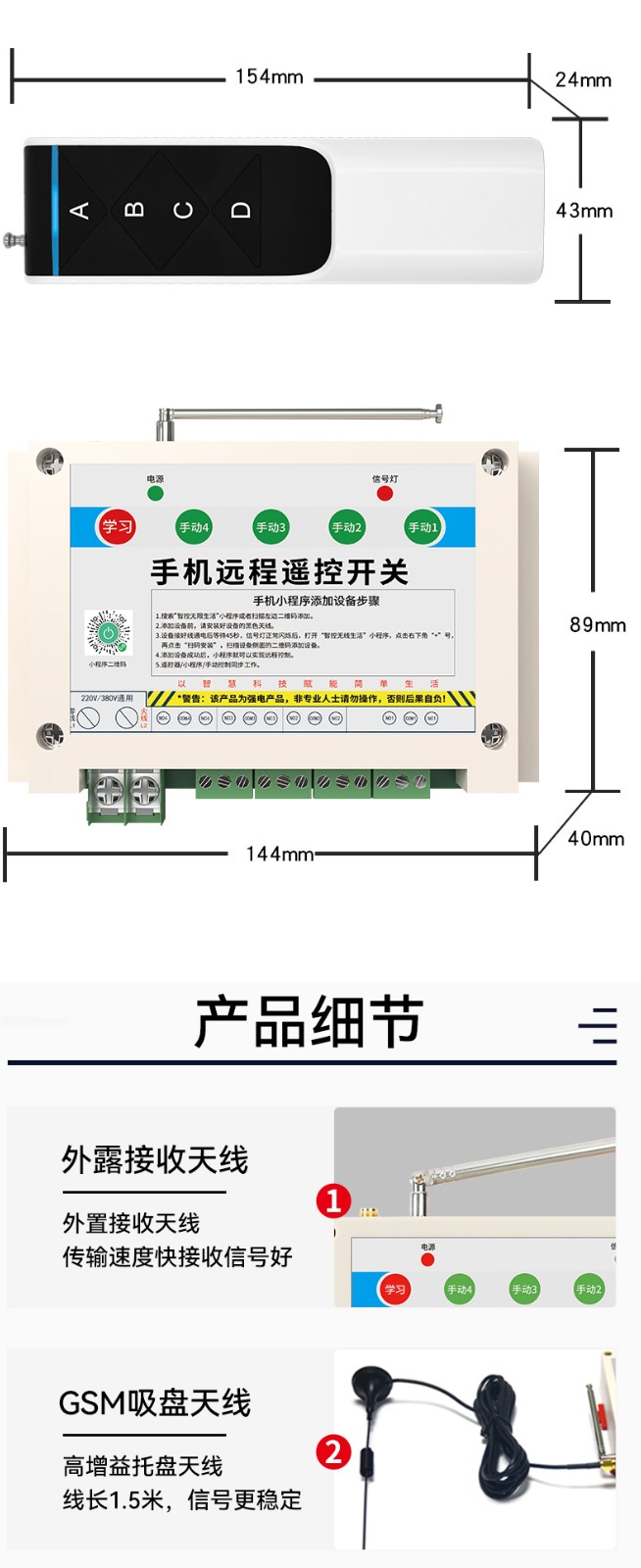 4G遠程控制開關(guān)(YS-G4) 產(chǎn)品規(guī)格 功能特點 資料下載 4G遠程控制開關(guān)(YS-G4)1.無需WiFi 、無需插卡、無需流量2.有手機信號就能控制 、手機無線距離(遙控器空曠距離4000米)3.分享管理 4.狀態(tài)反饋 5.實時反饋狀態(tài)5.自定義開關(guān)6.斷電反饋提醒7.一鍵分享控制方式:小程序控制 、 RF遙控器控制、 手動按鍵應(yīng)用場景:水泵電機, 增氧機 ,家居電器燈具,農(nóng)田灌溉,工廠機房設(shè)備